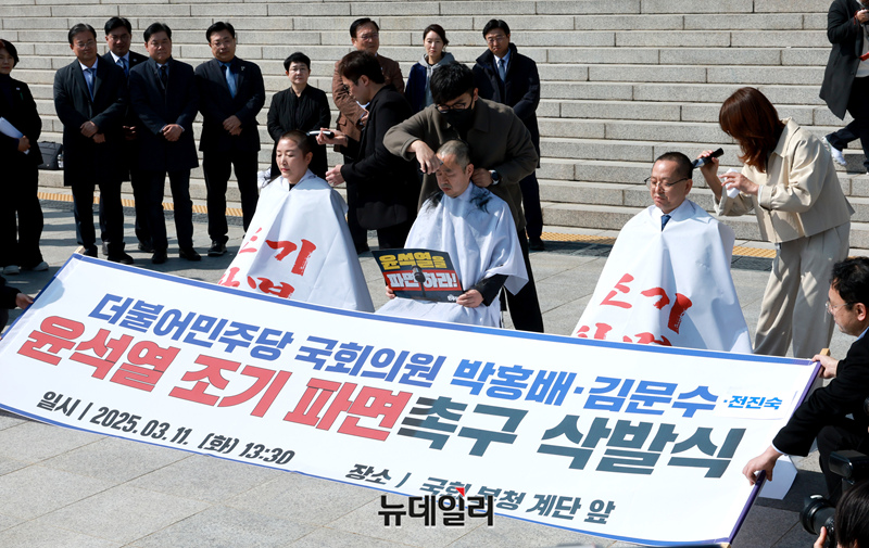 전진숙·박홍배·김문수 더불어민주당 의원이 11일 오후 국회에서 헌법재판소의 윤석열 대통령에 대한 조기 파면 결정을 촉구 삭발식을 하고 있다.