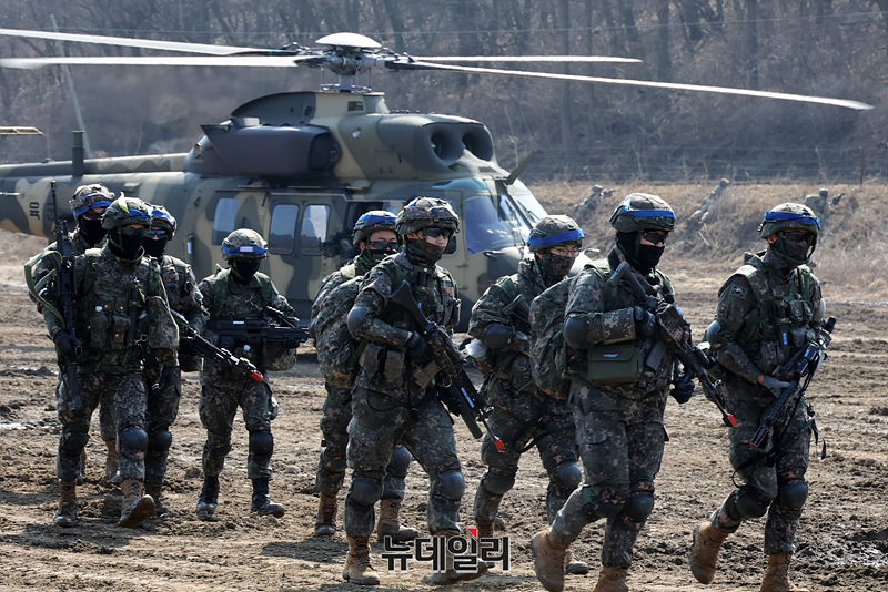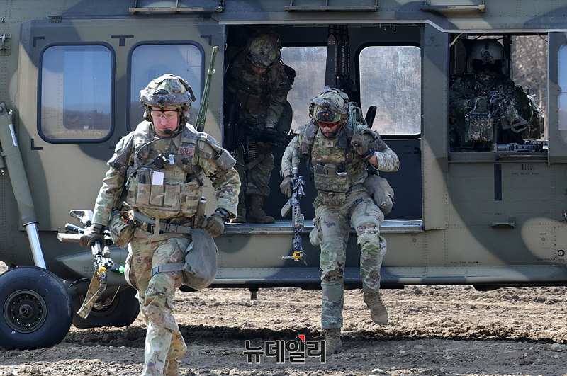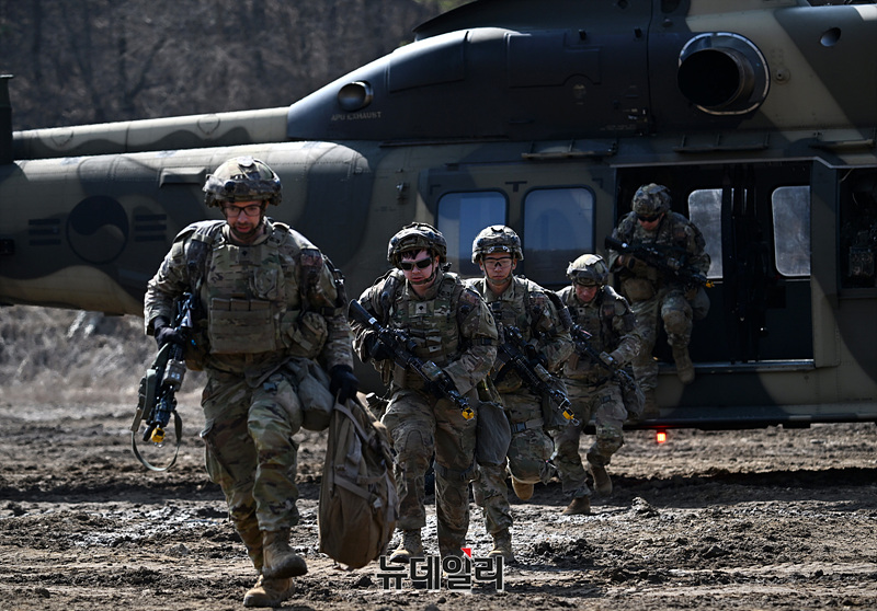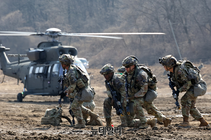 '한미 연합 공중강습 훈련'이 열린 11일 경기도 파주시 법원읍 무건리 훈련장에서 장병들이 목표지역 점령을 위해 전술기동 훈련을 하고 있다.