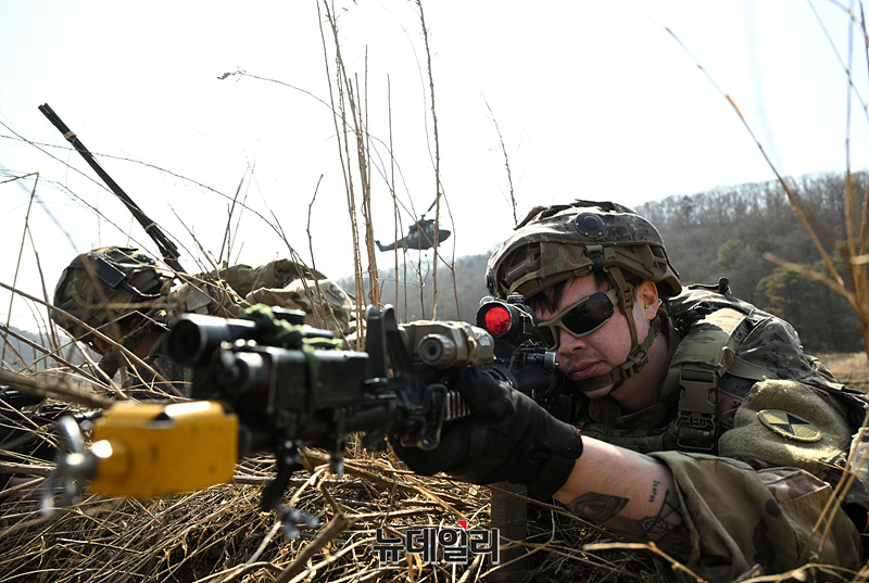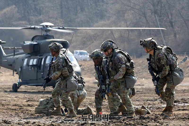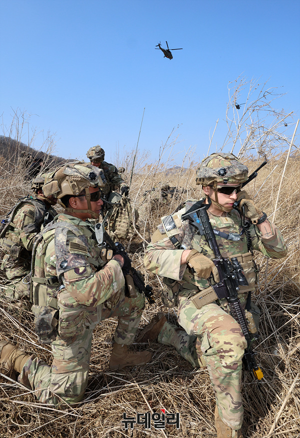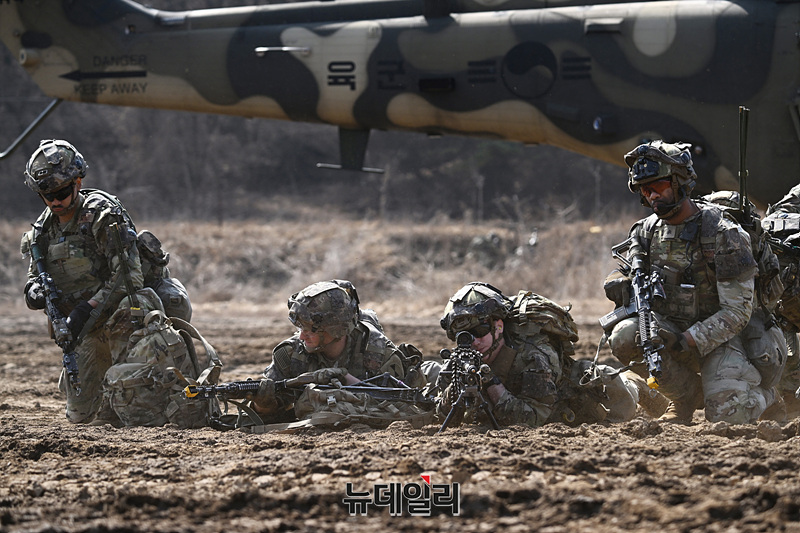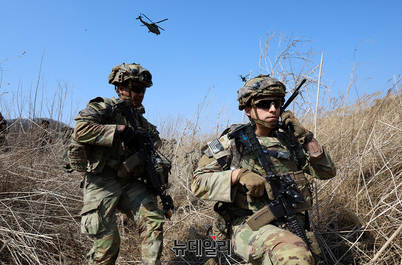 '한미 연합 공중강습 훈련'이 열린 11일 경기도 파주시 법원읍 무건리 훈련장에서 미국 장병들이 목표지역 점령을 위해 전술기동 훈련을 하고 있다.