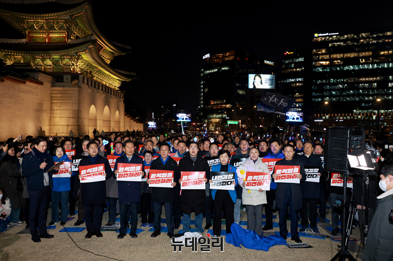 박찬대 더불어민주당 원내대표 등 소속 의원들이 11일 오후 서울 종로구 광화문 앞 농성장에서 열린 의원총회에서 윤석열 대통령 탄핵을 촉구 구호를 외치고 있다.