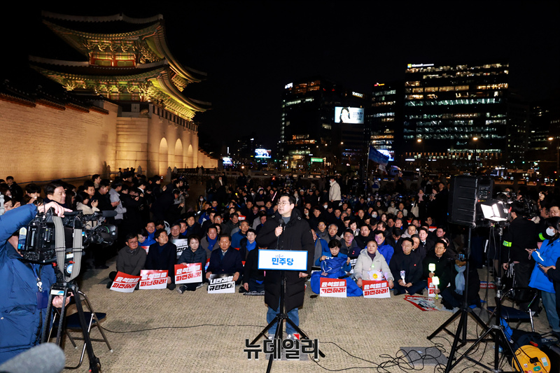 박찬대 더불어민주당 원내대표가 11일 오후 서울 종로구 광화문 앞 농성장에서 열린 의원총회에서 모두발언을 하고 있다.