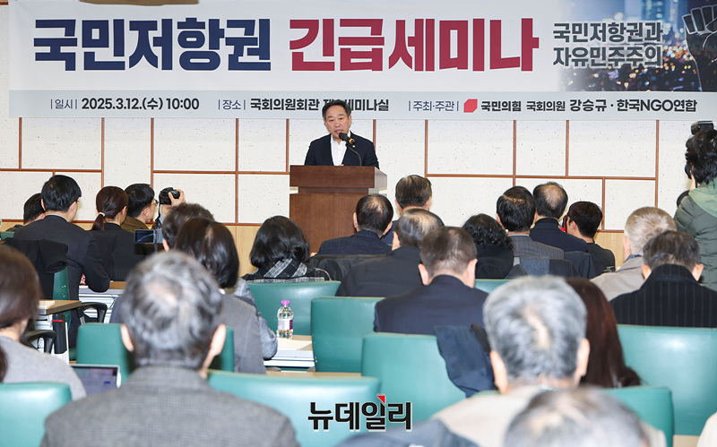 강승규 국민의힘 의원이 12일 오전 서울 여의도 국회 의원회관에서 열린 국민저항권 긴급세미나에서 개회사를 하고 있다.