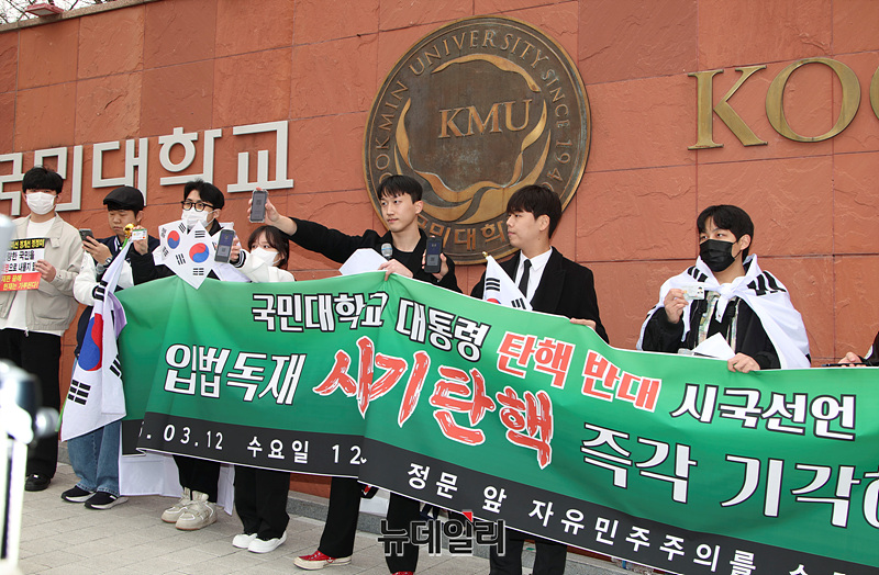 자유민주주의를 수호하는 국민인들이 12일 오후 서울 성북구 국민대학교 정문에서 윤 대통령 탄핵 반대 시국선언에 앞서 학생증을 들어 보이고 있다.