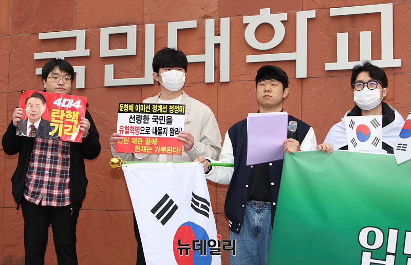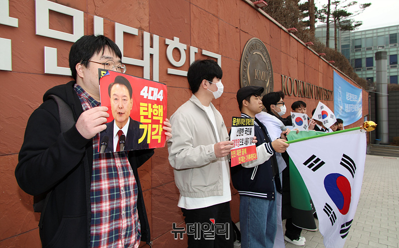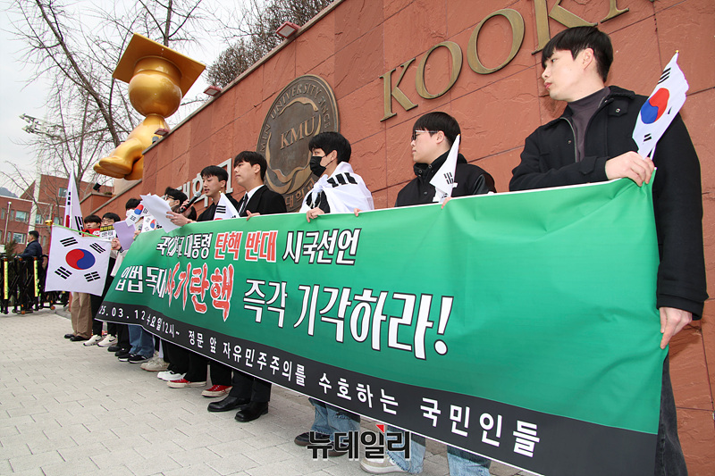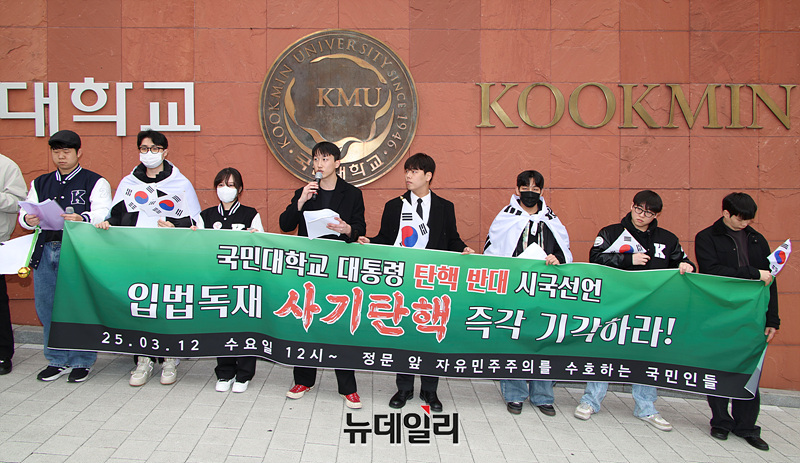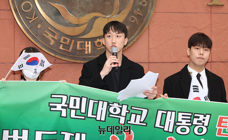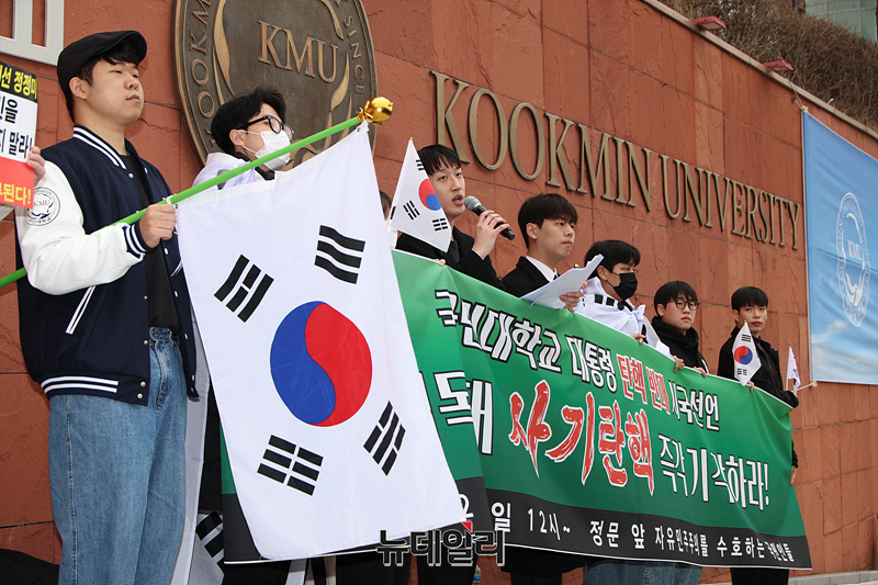 자유민주주의를 수호하는 국민인들이 12일 오후 서울 성북구 국민대학교 정문에서 윤 대통령 탄핵 반대 시국선언을 하고 있다.