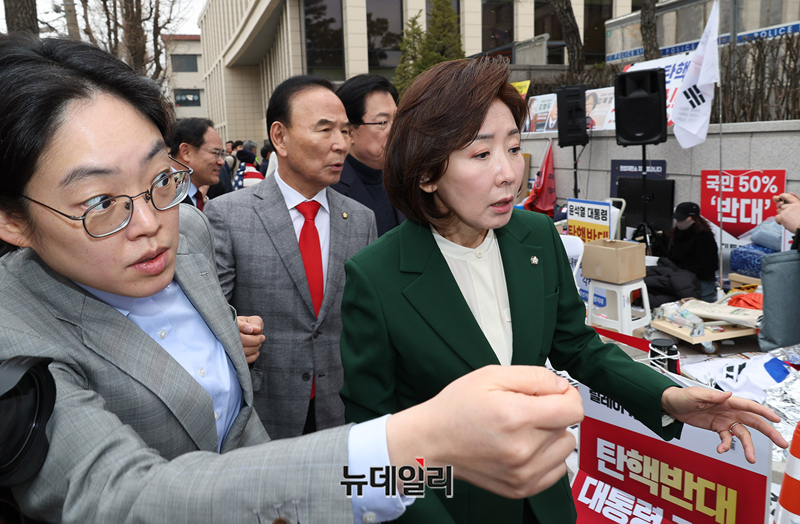 나경원 국민의힘 의원을 포함한 의원들이 12일 오전 서울 종로구 헌법재판소를 찾아 탄핵반대 2차 탄원서를 제출한 직후 릴레이 농성중인 윤상현 의원을 찾아 격려하고 있다. 이들은 헌법재판소 앞에서 단식농성을 하고 있는 시민들과 탄핵반대 당협위원장 모임을 각각 격려했다.