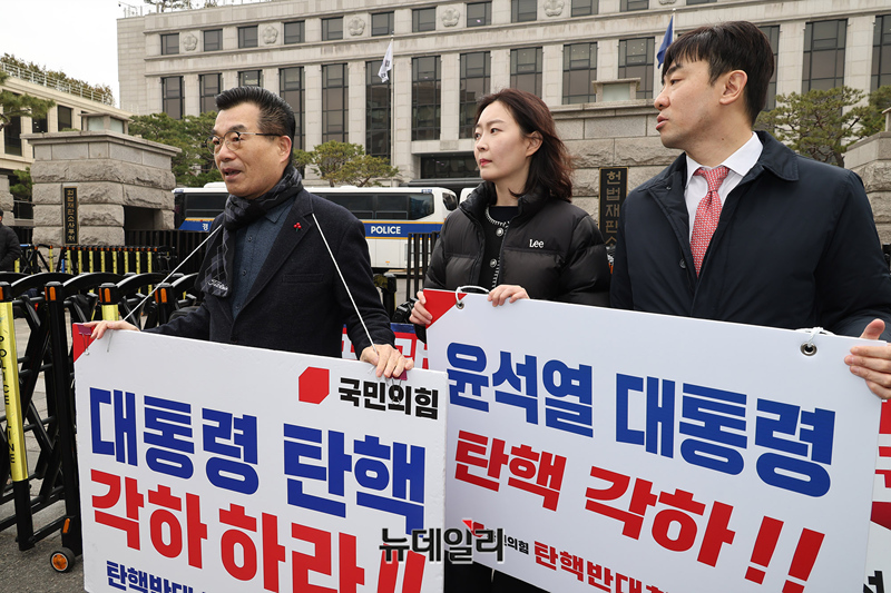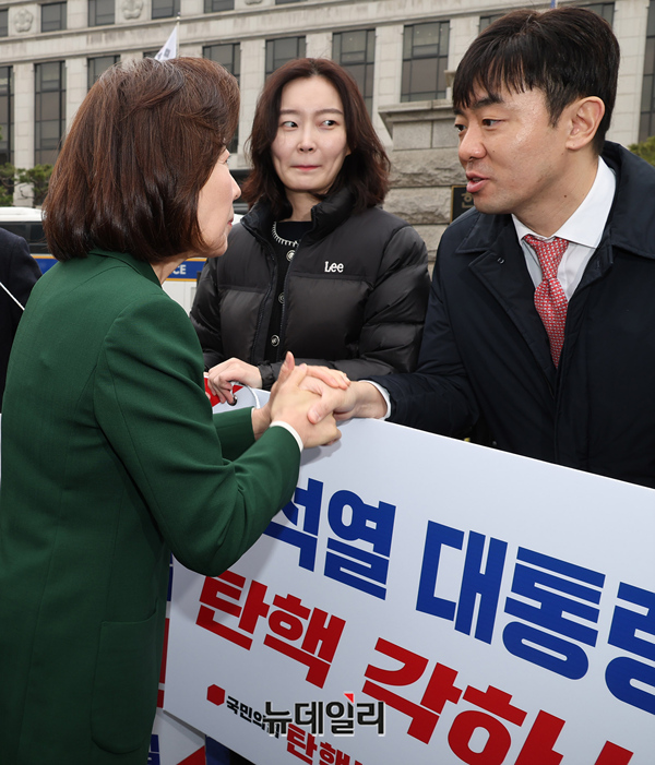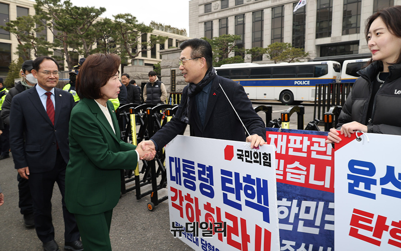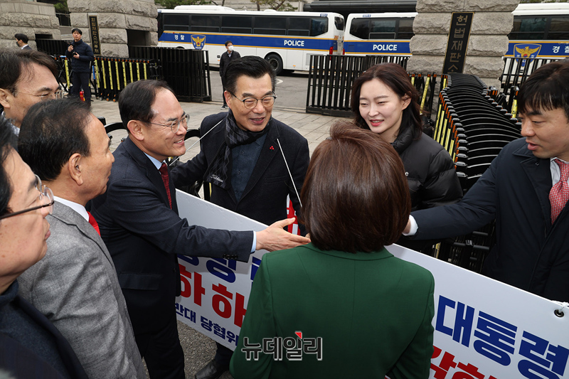 나경원 국민의힘 의원을 포함한 의원들이 12일 오전 서울 종로구 헌법재판소를 찾아 탄핵반대 2차 탄원서를 제출하고 인근에서 탄핵반대 릴레이 시위중인 당협위원장모임을 찾아 격려하고 있다.