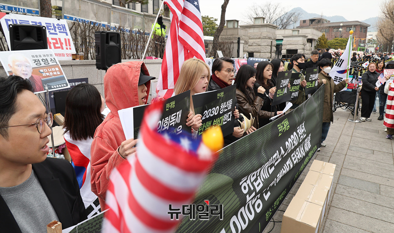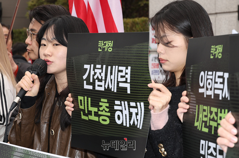탄핵을반대하는대한민국청년들(탄대청)이 12일 오전 서울 종로구 헌법재판소 앞에서 15,000명 탄핵반대 탄원서 제출에 앞서 기자회견을 갖고 있다. 앞서 국민의힘 의원 82명도 탄핵을 반대하는 2차 탄원서를 헌재에 제출했다.