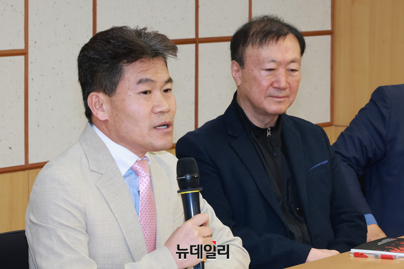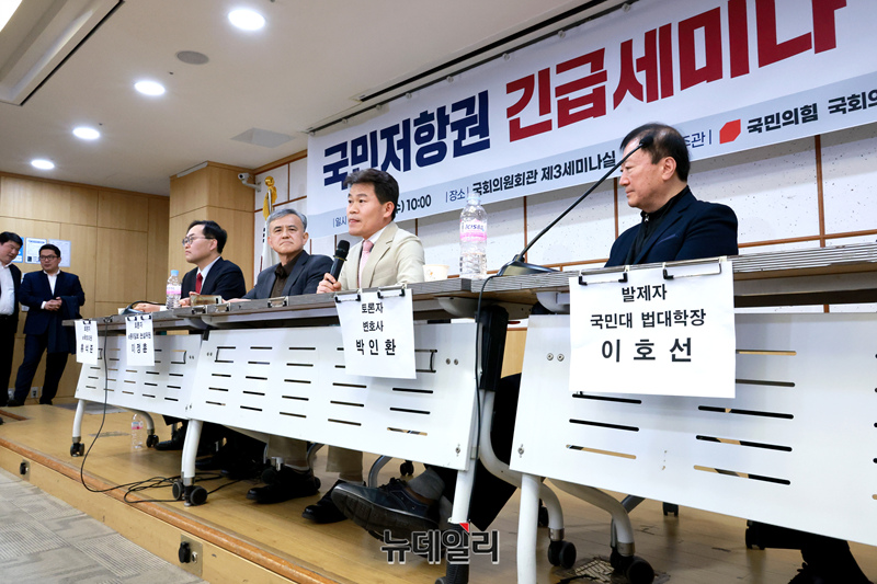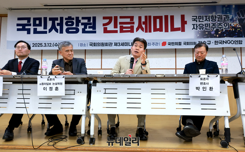 한국사 강사 전한길 씨가 12일 오전 국회 의원회관 세미나실에서 열린 국민저항권 긴급세미나에서 기조 강연을 하고 있다.