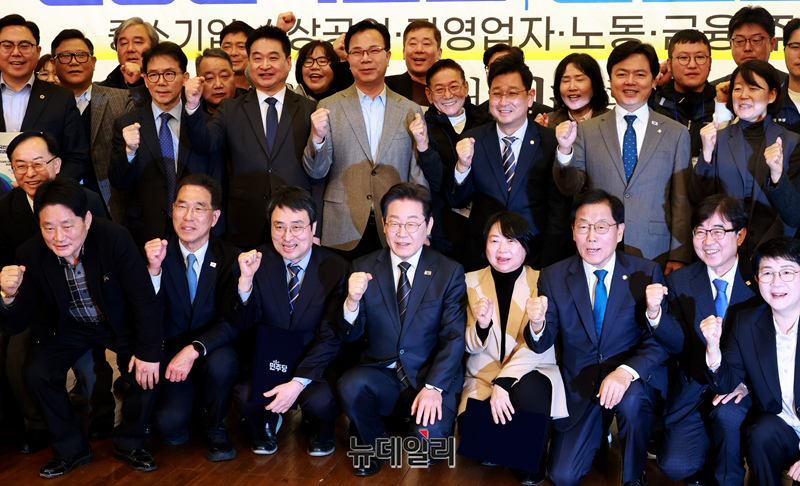 이재명 더불어민주당 대표가 12일 오전 국회 도서관에서 열린 2025 더불어민주당 민생연석회의 20대 민생의제 발표회에서 참석자들과 기념촬영을 하고 있다.