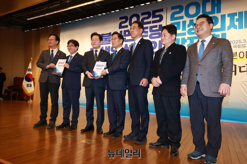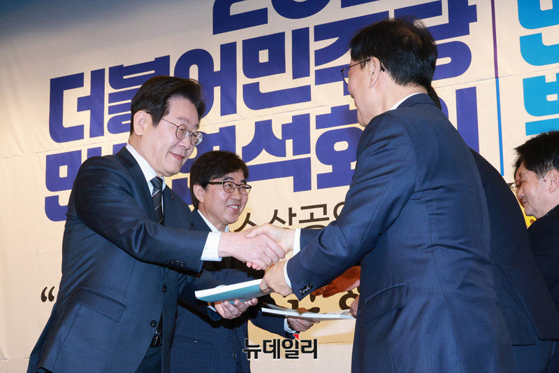 이재명 더불어민주당 대표가 12일 오전 국회 도서관 대강당에서 열린 2025 더불어민주당 민생연석회의 20대 민생의제 발표회에서 민생의제를 전달받고 있다.