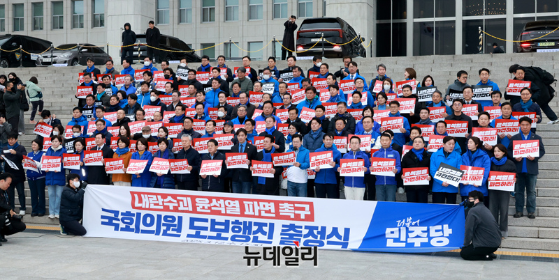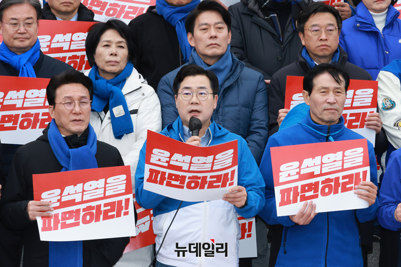 박찬대 더불어민주당 원내대표가 12일 오후 국회 본청 앞에서 내란수괴 윤석열 파면 촉구 국회의원 도보행진 출정식에서 발언을 하고 있다.