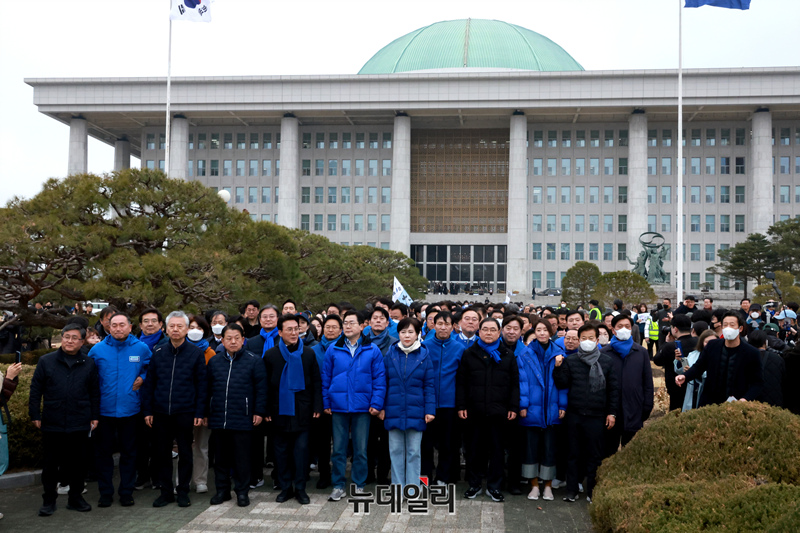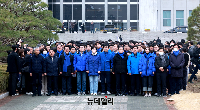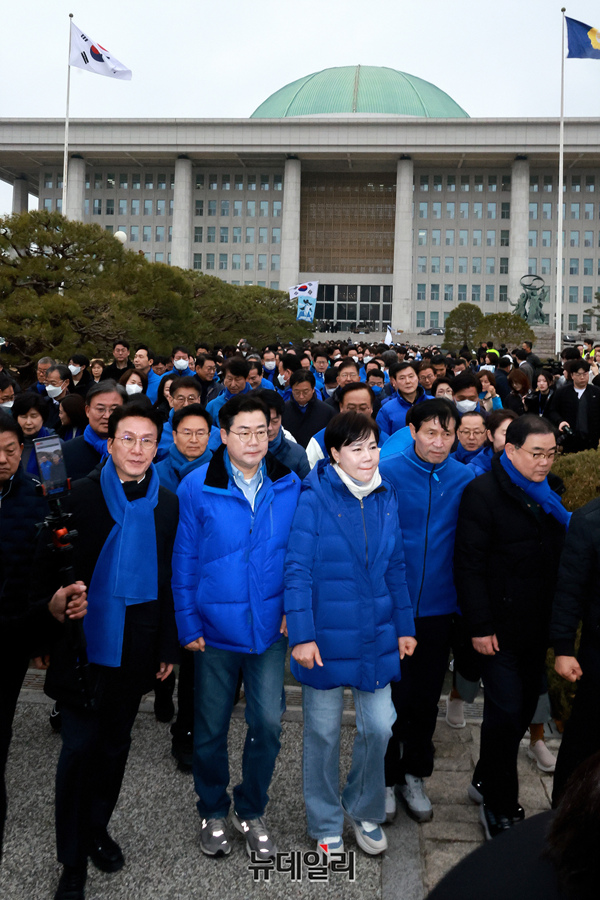 박찬대 더불어민주당 원내대표를 및 의원들이 12일 오후 국회 본청 앞에서 내란수괴 윤석열 파면 촉구 국회의원 도보행진 출정식을 마치고 이동하고 있다.