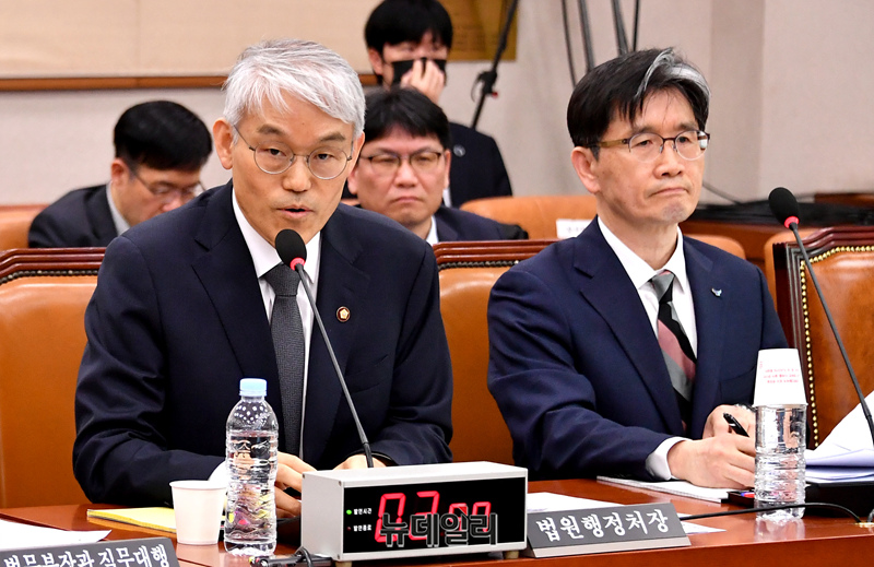천대엽 법원행정처장이 12일 국회에서 열린 법제사법위원회 전체회의에 출석해 의원들이 질문에 답하고 있다.