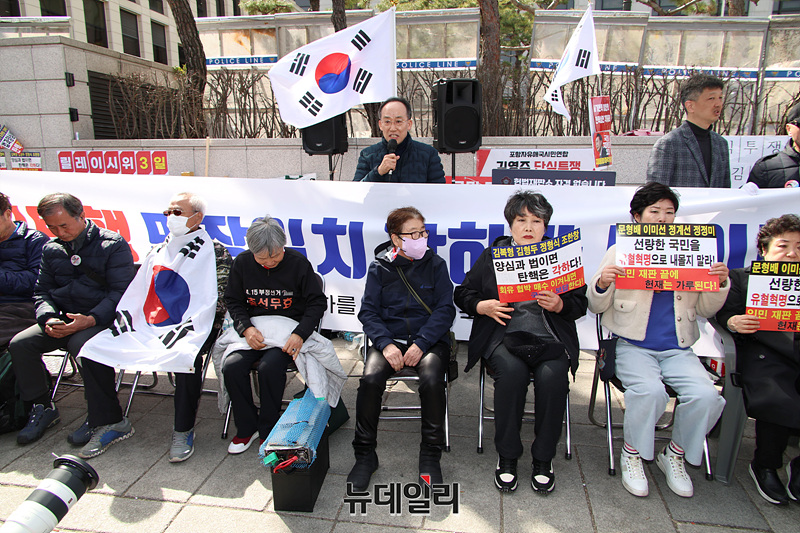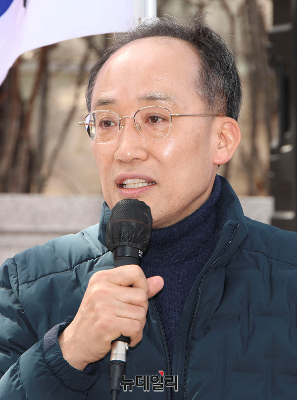윤석열 대통령 탄핵재판 선고를 앞둔 13일 오후 서울 종로구 헌법재판소 앞에서 열린 윤 대통령 탄핵 반대 삭발식에서 추경호 국민의힘 의원이 발언하고 있다.
