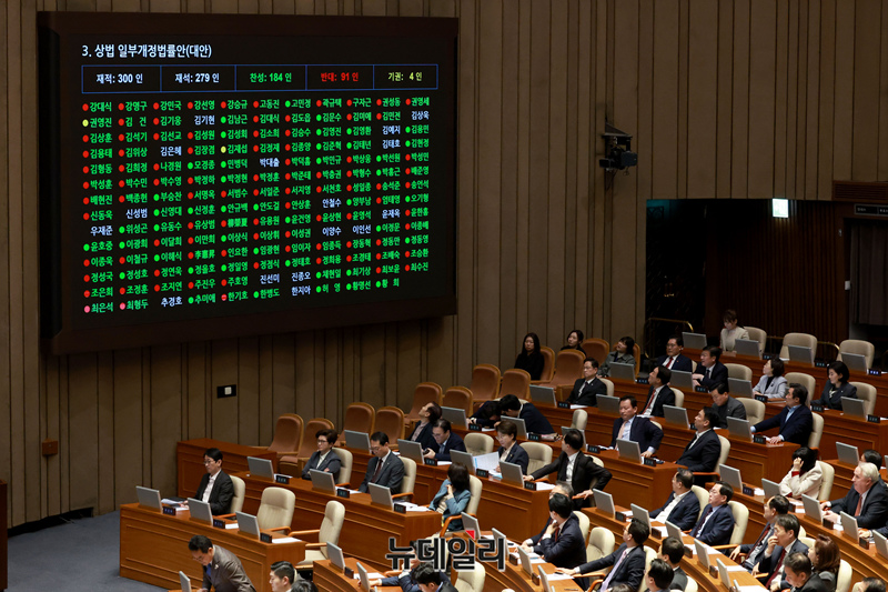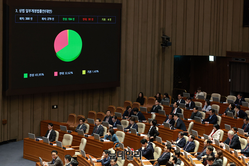 주주에 대한 이사의 충실 의무 등을 골자로 한 상법 개정안이 13일 국회 본회의에서 재석 279석 중 △찬성 184표 △반대 91표 △기권 4표로 통과되고 있다.