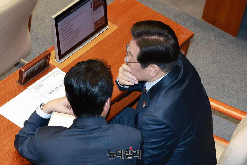 이재명 더불어민주당 대표와 김민석 최고위원이 13일 오후 국회에서 열린 본회의에서 대화를 나누고 있다.