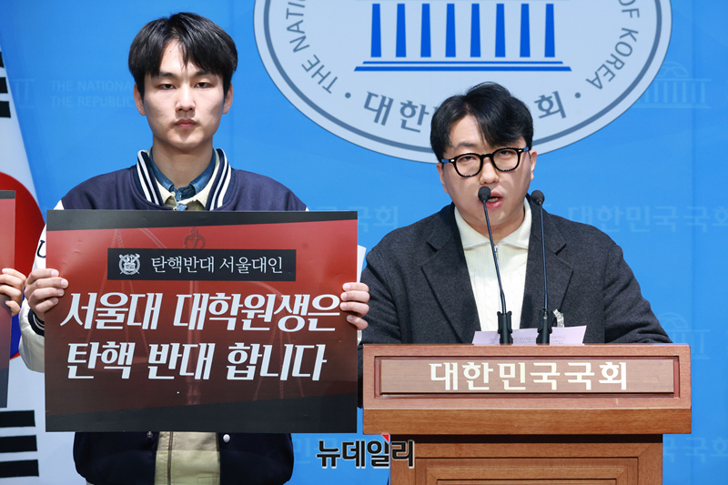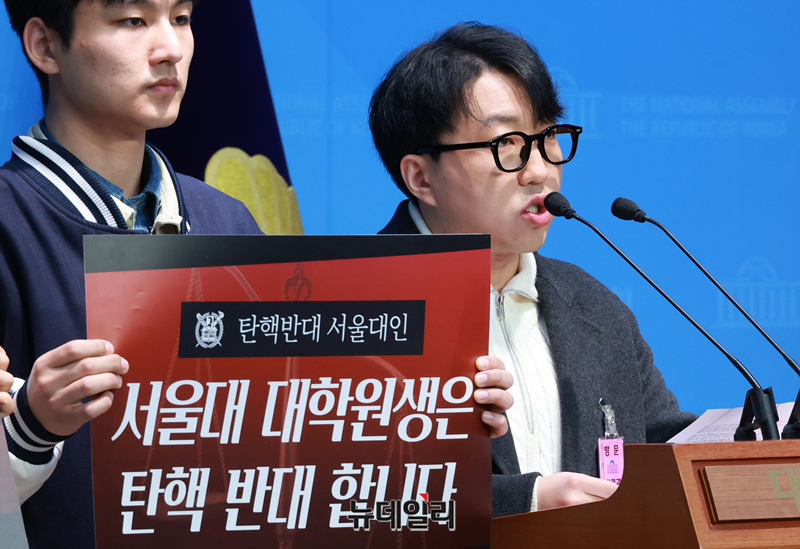 서울대 대학원생들이 14일 오전 국회 소통관에서 윤석열 대통령 탄핵 반대 기자회견을 하고 있다.