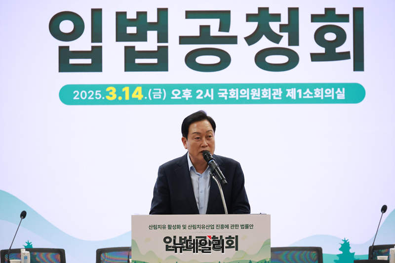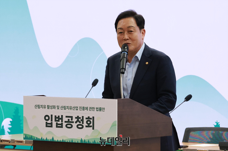 김선교 국민의힘 의원이 14일 국회 의원회관에서 열린 '산림치유 활성화 및 산림치유산업 진흥에 관한 법률 입법공청회'에서 인사말을 하고 있다.