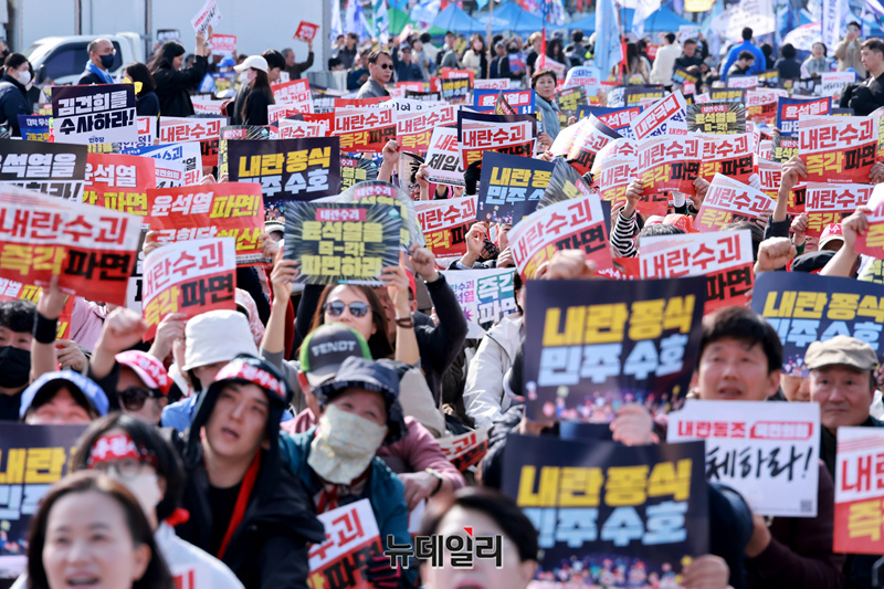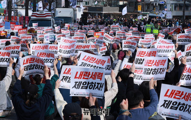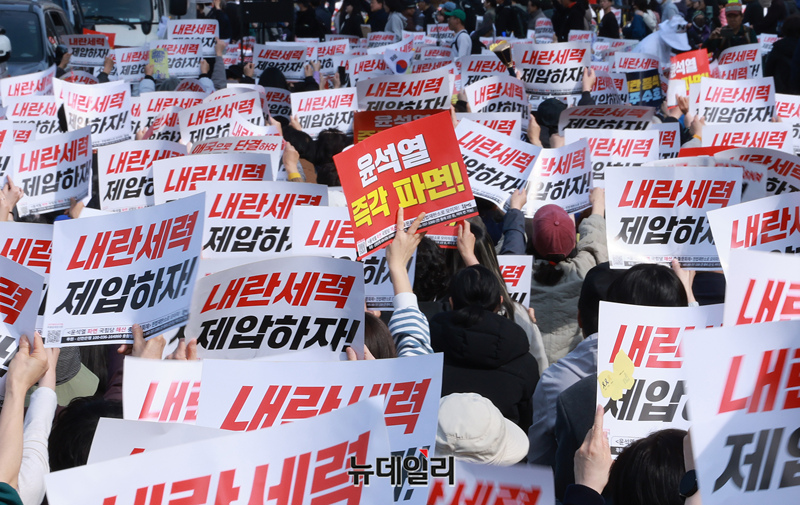 [포토] 파면 촉구 구호 외치는 시위 참가자들