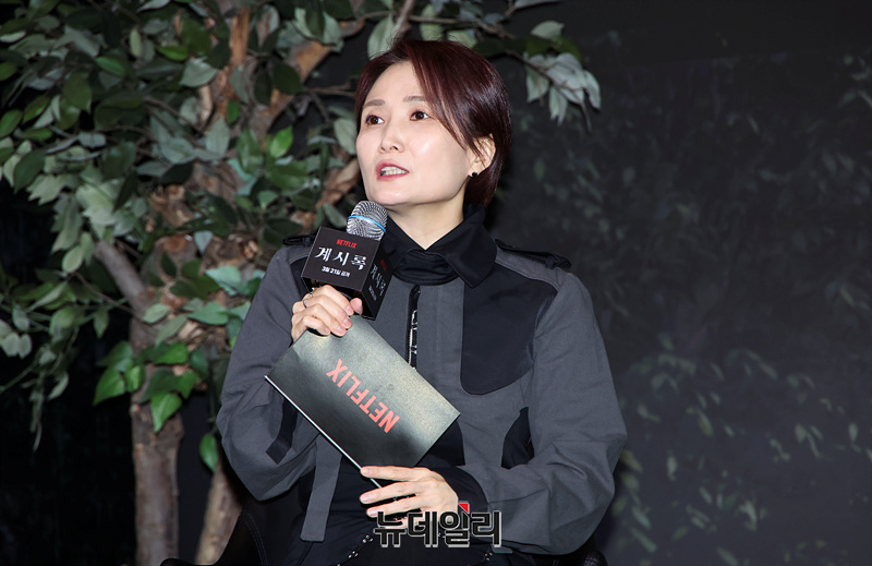 방송인 박경림이 18일 오전 서울 마포구 호텔 나루에서 넷플릭스 영화 '계시록'을 소개하고 있다.