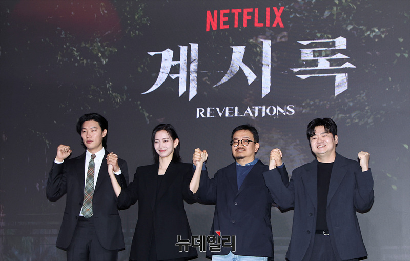 배우 류준열, 신현빈, 신민재, 연상호 감독이 18일 오전 서울 마포구 호텔 나루에서 열린 넷플릭스 영화 '계시록' 제작발표회에서 포즈를 취하고 있다.