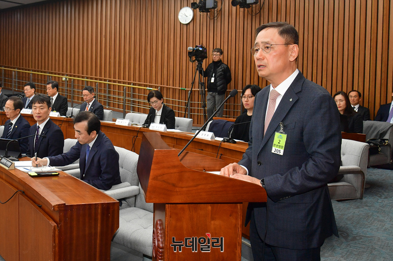 금정호 신영증권 사장 18일 오전 국회 정무위원회에서 열린 홈플러스·MBK 파트너스 및 삼부토건 관련 긴급 현안질의에서 의원 질의에 답하고 있다.