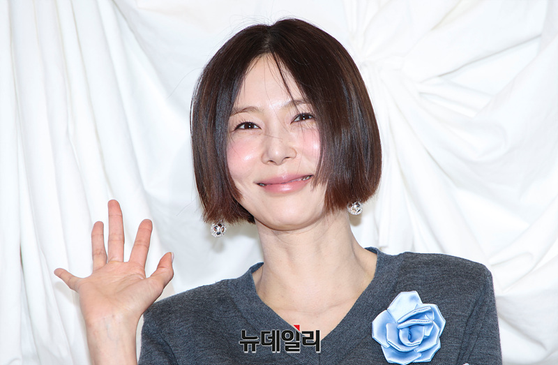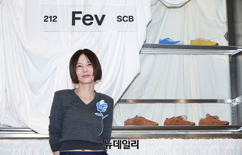 방송인 김나영이 18일 오후 서울 성동구 무신사 스토어 성수 대림창고에서 열린 신발 브랜드 슈콤마보니 팝업스토어 오픈 기념 포토월에서 포즈를 취하고 있다.