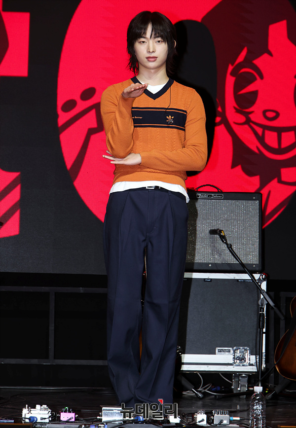 밴드 드래곤포니(Dragon Pony) 권세혁이 19일 오후 서울 서대문구 예스24 원더로크홀에서 열린 두 번째 EP '낫 아웃(Not Out)' 발매 기념 쇼케이스에서 포즈를 취하고 있다.