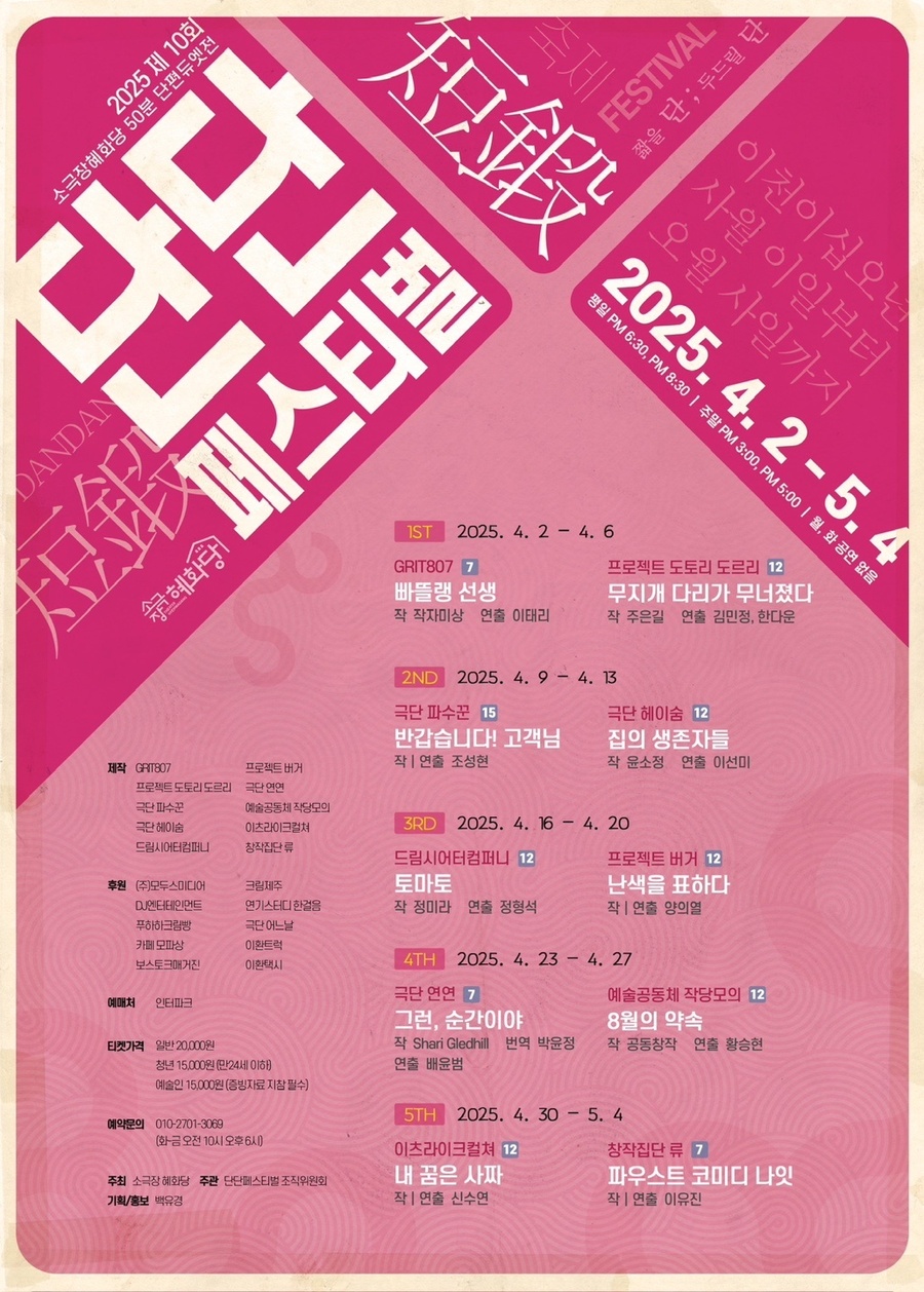 '50분 단편듀엣전'으로 불리는 이번 페스티벌에는 △그릿807 △프로젝트 도토리 도토리 △극단 파수꾼 △극단 헤이숨 △드림시어터컴퍼니 △프로젝트 버거 △극단 연연 △예술공동체 작당모의 △이츠라이크컬쳐 △창작집단 류 등 10개 팀이 참가해 50분짜리 단막극을 각각 선보인다. 오는 4월 2일부터 5월 4일까지 순차적으로 2개 팀씩 '소극장 혜화당'에서 공연을 펼칠 예정이다. -