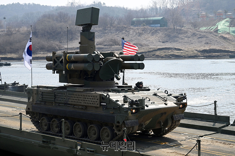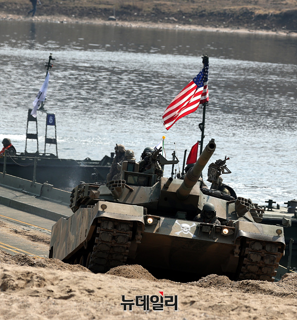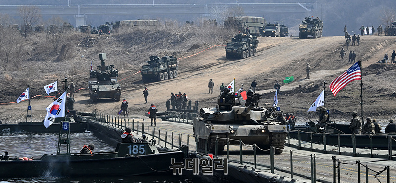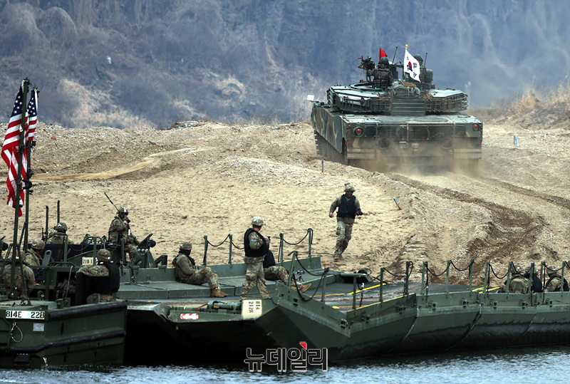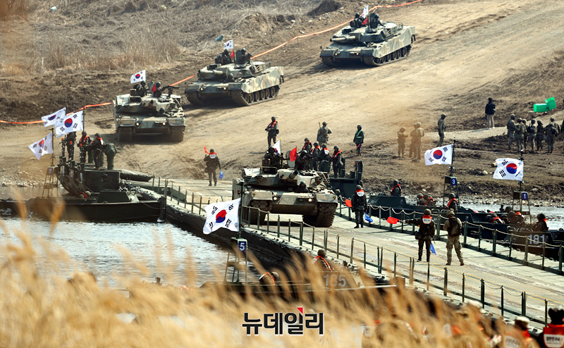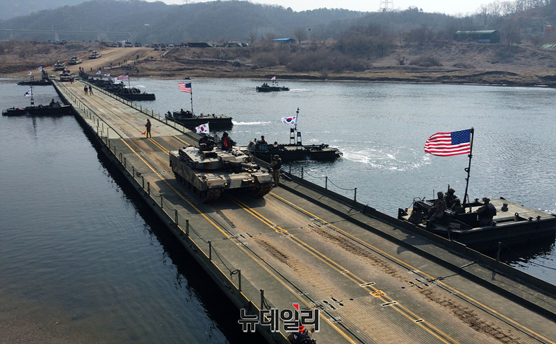 한미 연합 제병협동 도하훈련이 진행중인 20일 경기 연천군 임진강 일대 석은소 훈련장에서 국군 장비부대가 연합부교를 건너고 있다. (사진=공동취재단)