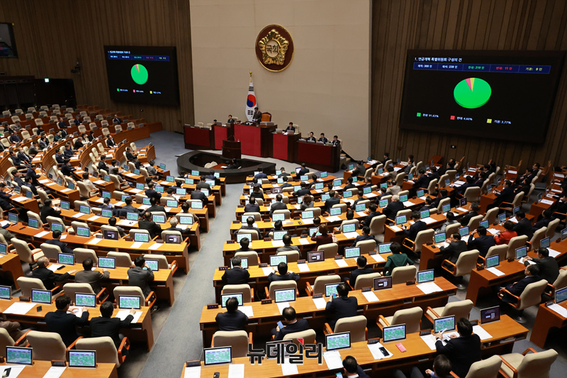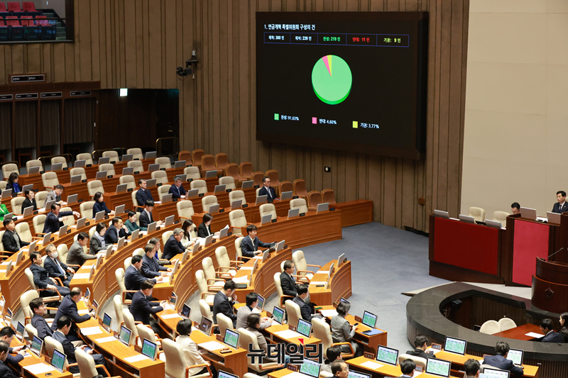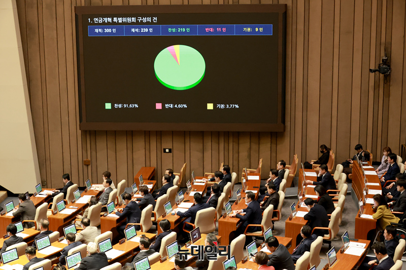 연금개혁 특별위원회 구성의 건이 20일 오후 국회 본회의에서 재석 239명, 찬성 219명, 반대 11명, 기권 9명으로 통과되고 있다.