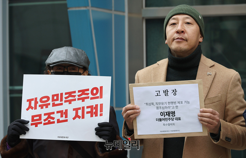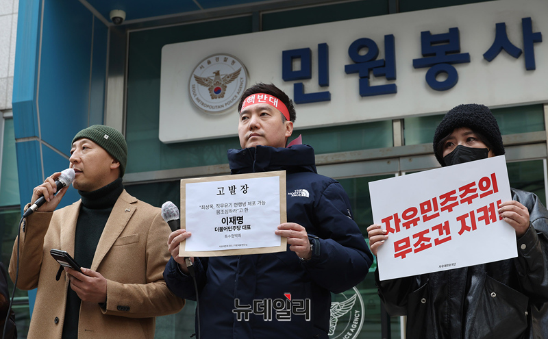 오상종 자유대한호국단장이 20일 오후 서울 종로구 서울경찰청 앞에서 이재명 더불어민주당 대표를 특수협박죄 혐의로 고발하며 입장을 밝히고 있다.