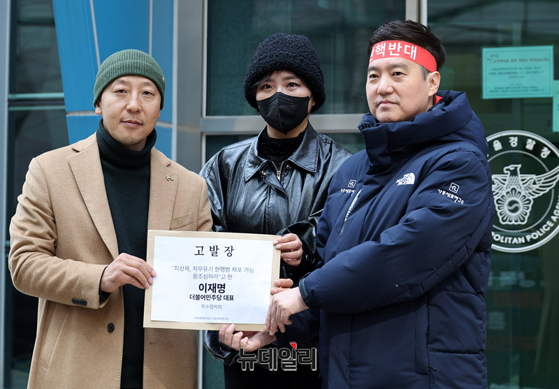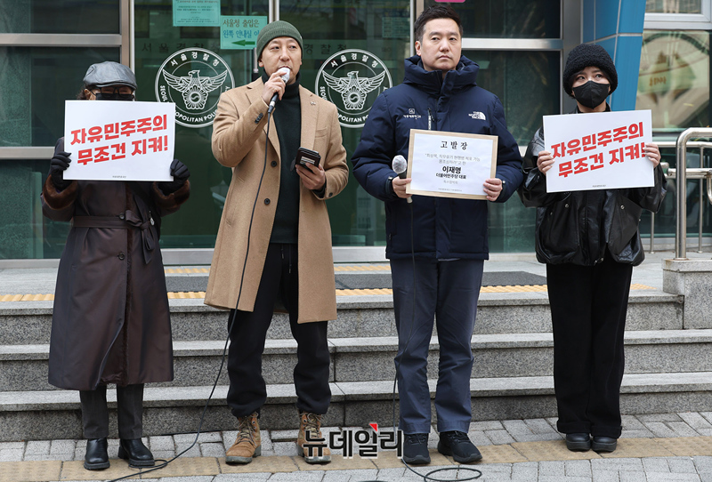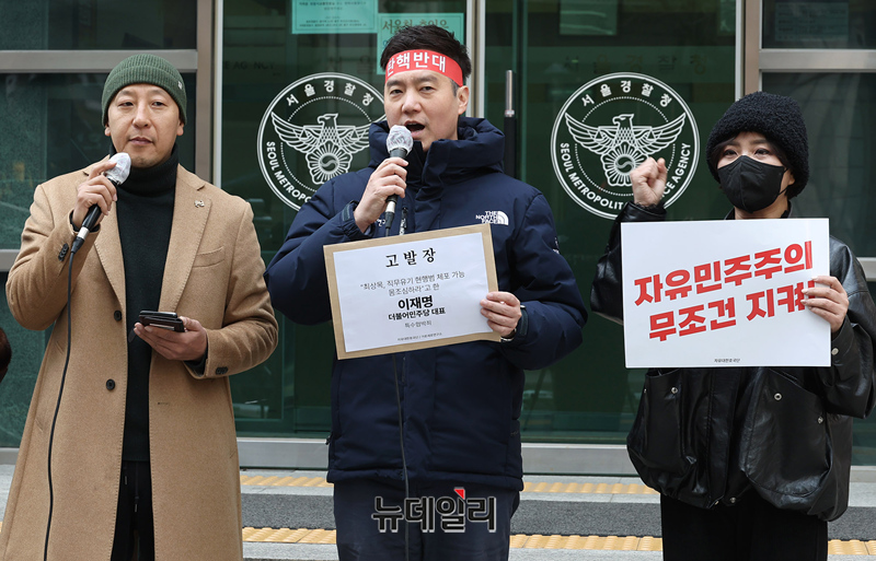 오상종 자유대한호국단장(왼쪽부터), 김세의 가세연 대표, 김소연 변호사가 20일 오후 서울 종로구 서울경찰청 앞에서 이재명 더불어민주당 대표를 특수협박죄 혐의로 고발하며 입장을 밝히고 있다.