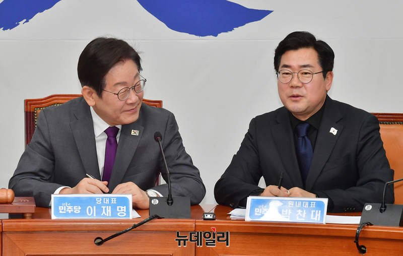 이재명 더불어민주당 대표와 박찬대 원내대표가 21일 국회에서 열린 최고위원회의에 참석해 대화를 나누고 있다.