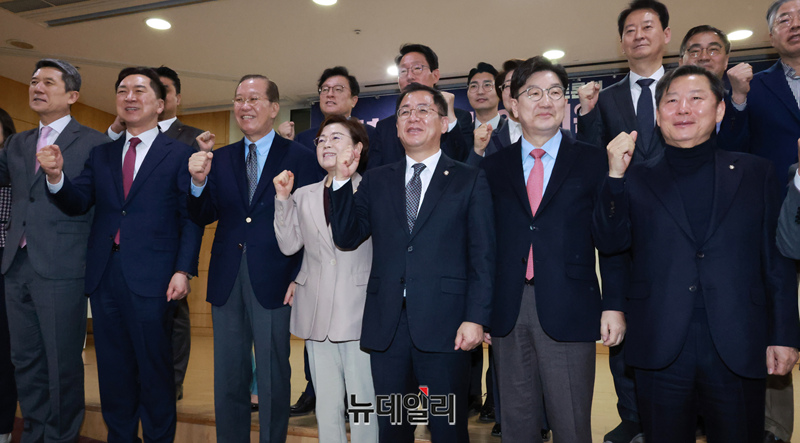 권영세 국민의힘 비상대책위원장, 권성동 원내대표, 이상휘·김정재·김기현·이철규 의원, 이강덕 포항시장을 비롯한 참석자들이 21일 국회 의원회관에서 열린 이차전지산업 지원 특별법 제정 국회 토론회에서 기념촬영을 하고 있다.