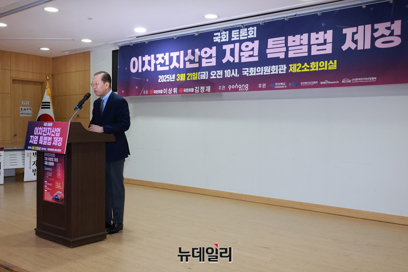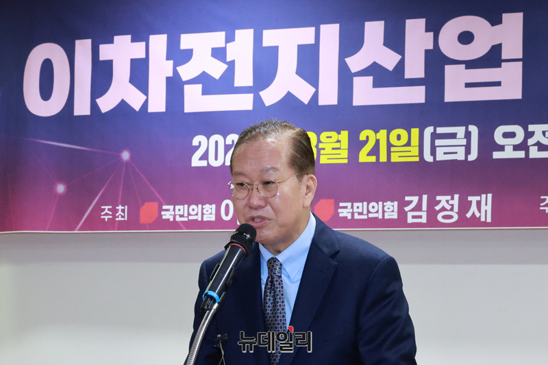 권영세 국민의힘 비상대책위원장이 21일 국회 의원회관에서 열린 이차전지산업 지원 특별법 제정 국회 토론회에서 축사를 하고 있다.