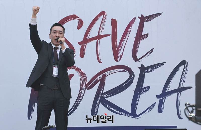김민수 전 국민의힘 대변인이 21일 오후 강원 춘천시 강원도청 앞에서 열린 윤석열 대통령 탄핵반대 세이브코리아 강원 국가비상기도회에서 연단에 오르기 직전 기도를 하고 있다.