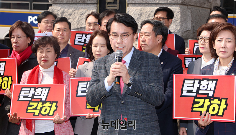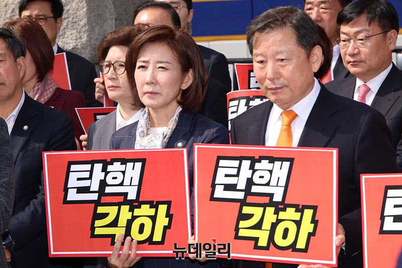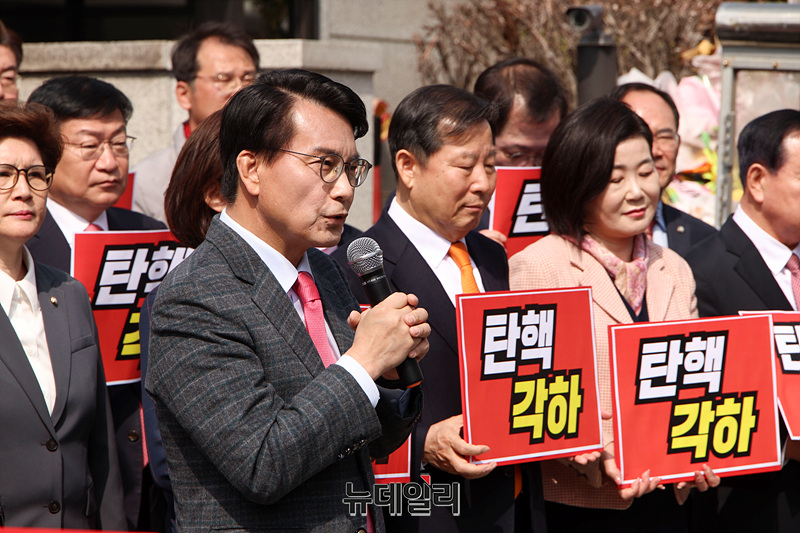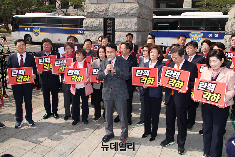 박대출, 조배숙, 이철규, 나경원, 윤상현 의원을 비롯한 국민의힘 의원들이 24일 오전 서울 종로구 헌법재판소 앞에서 한덕수 국무총리에 대한 국회의 탄핵소추 기각 관련 입장 발표 기자회견을 하고 있다.