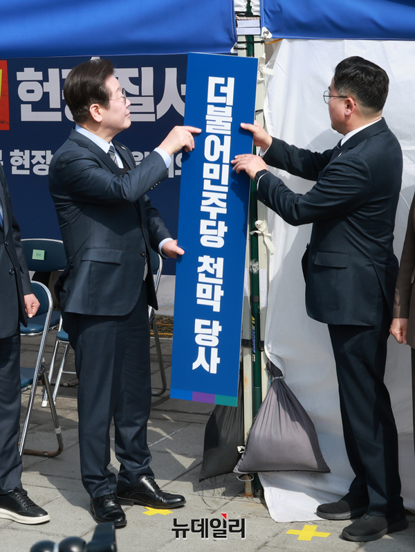 이재명 더불어민주당 대표, 박찬대 원내대표 및 지도부가 24일 오전 서울 광화문 앞 민주당 천막당사에서 열린 최고위원회의에 앞서 현판식을 갖고 있다.