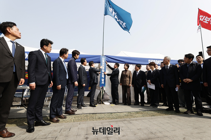 [포토] 광화문 앞 천막에 당사 현판 건 민주당