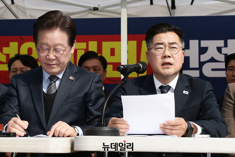 박찬대 더불어민주당 원내대표가 24일 오전 서울 광화문 앞 민주당 천막당사에서 열린 최고위원회의에 모두발언을 하고 있다.