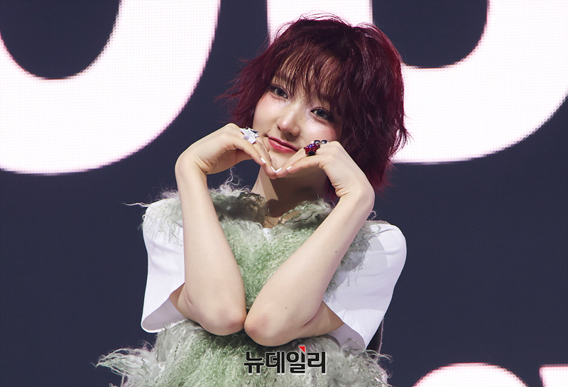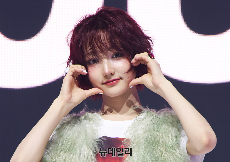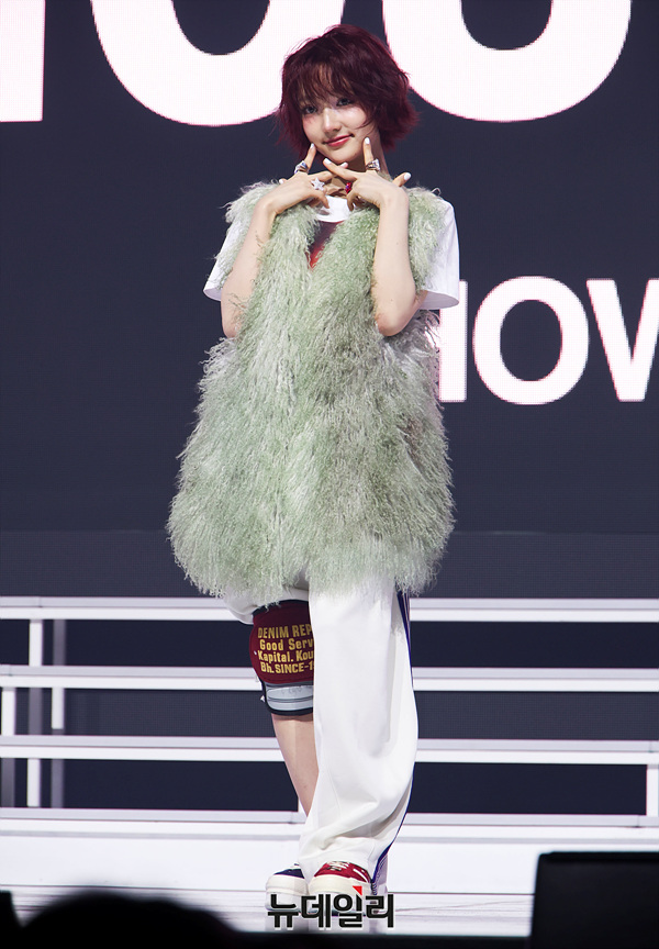 그룹 키키(KiiiKiii) 지유가 24일 오후 서울 용산구 블루스퀘어에서 열린 데뷔 앨범 '언컷 젬(UNCUT GEM)' 발매 및 데뷔 기념 쇼케이스에서 포즈를 취하고 있다.