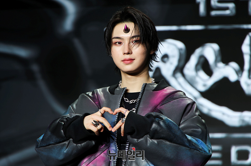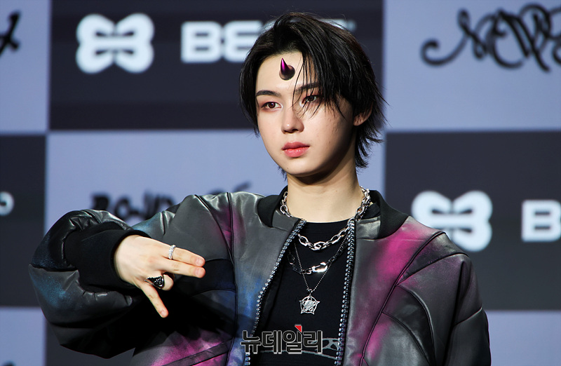 그룹 뉴비트(NEWBEAT) 김태양이 24일 오후 서울 강남구 일지아트홀에서 열린 정규 1집 '러 앤 래드(RAW AND RAD)' 발매 및 데뷔 기념 쇼케이스에서 포즈를 취하고 있다.