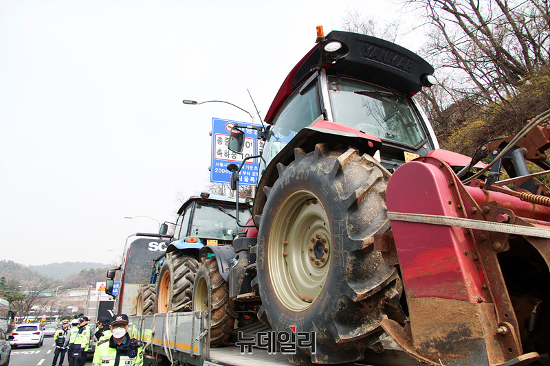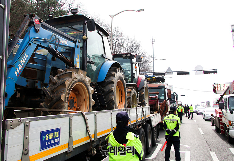 [포토] '전농' 트랙터 실은 화물차 상경 시도...경찰 제지