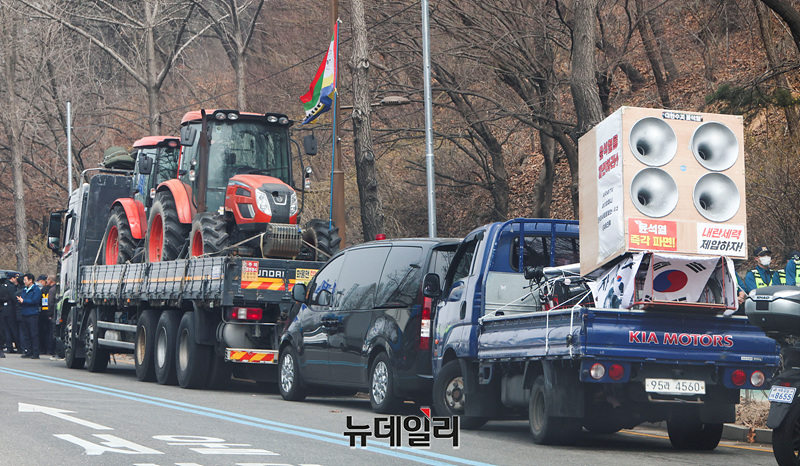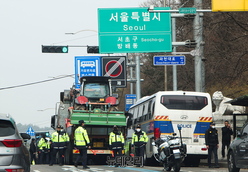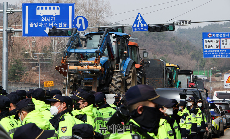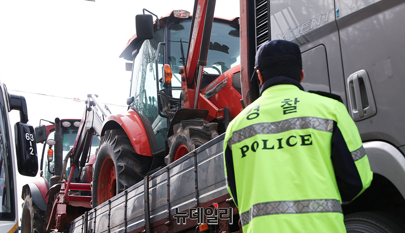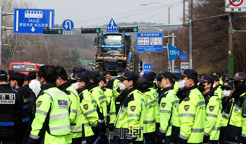 전국농민회총연맹(전농)의 윤석열 대통령 탄핵을 촉구하는 트랙터 상경 시위에 대해 법원이 트럭 20대 진입만 허용한 가운데 25일 오전 서울 서초구 남태령역 인근에서 트랙터를 실은 화물차들이 서울 진입을 시도하자 경찰들이 현장을 통제하고 있다.