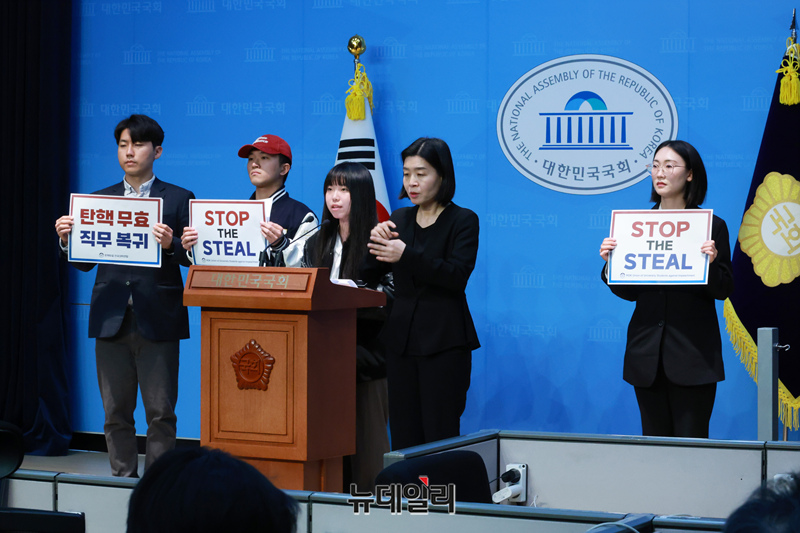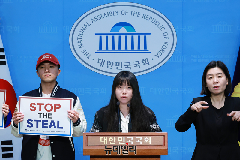 탄핵무효 전국대학연합 학생들이 25일 오전 국회 소통관에서 기자회견을 갖고 윤석열 대통령 탄핵무효를 촉구하고 있다.