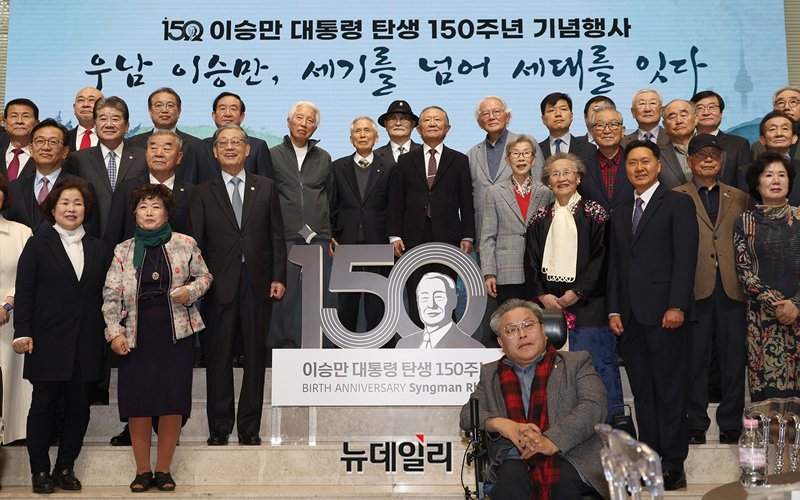김황식 이승만대통령기념재단 이사장을 비롯한 주요 참석자들이 25일 오후 서울 중구 한국자유총연맹에서 '우남 이승만 세기를 넘어 세대를 잇다'를 주제로 열린 이승만 대통령 탄생 150주년 기념행사에서 150주년 기념 엠블럼을 공개하고 있다.이날 기념행사는 학술회의, 청년세대와 미래세대 원탁회의로 진행된다. 학술회의 발표는 이영훈 전 서울대 교수, 김명섭 연세대 교수가 맡았다. 이어진 토론은 김영림 일본 츄오대 박사, 주대환 죽산조봉암선생기념사업회 부회장, 소설가 복거일 씨가 나섰다.이어진 원탁회의에는 조평세 1776연구소 대표, 손영광 바른청년연합대표, 김민아 빌드업코리아 대표, 책읽는사자 사자그라운드 대표, 박상윤 교사, 이현우 연세대 대학원생, 김형균, 박애린 고등학생이 참석했다.