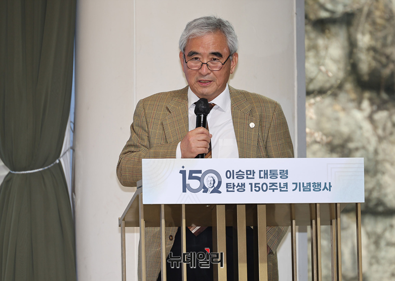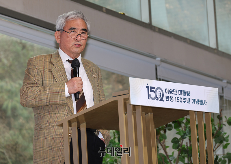 이영훈 전 서울대 교수가 25일 오후 서울 중구 한국자유총연맹에서 '우남 이승만 세기를 넘어 세대를 잇다'를 주제로 열린 이승만 대통령 탄생 150주년 기념행사에서 '조선의 쇠퇴와 청년 이승만'을 발제하고 있다.이날 기념행사는 학술회의, 청년세대와 미래세대 원탁회의로 진행된다. 학술회의 발표는 이영훈 전 서울대 교수, 김명섭 연세대 교수가 맡았다. 이어진 토론은 김영림 일본 츄오대 박사, 주대환 죽산조봉암선생기념사업회 부회장, 소설가 복거일 씨가 나섰다.이어진 원탁회의에는 조평세 1776연구소 대표, 손영광 바른청년연합대표, 김민아 빌드업코리아 대표, 책읽는사자 사자그라운드 대표, 박상윤 교사, 이현우 연세대 대학원생, 김형균, 박애린 고등학생이 참석했다.
