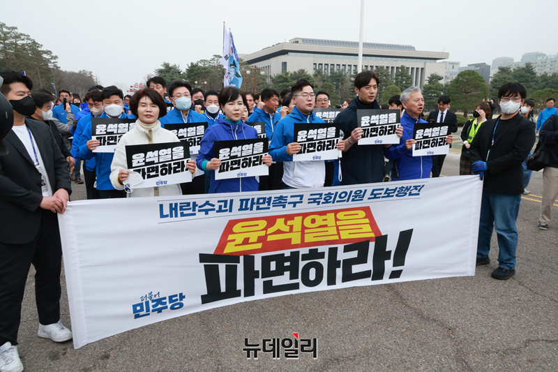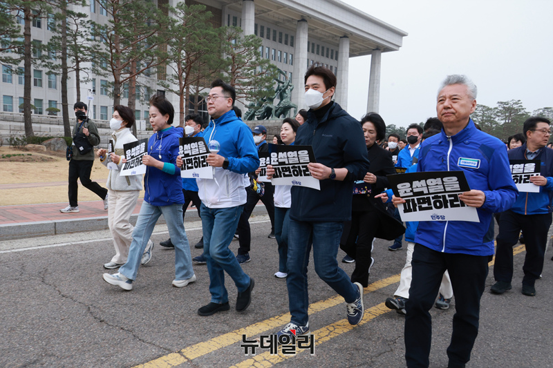 윤석열 대통령 파면 촉구 도보 행진에 참여한 국회의원들이 25일 국회에서 광화문을 향해 출발하고 있다.