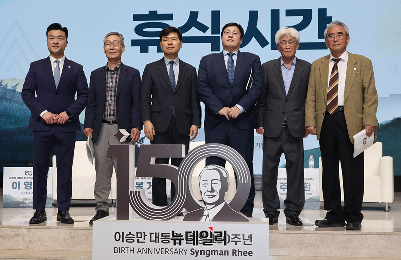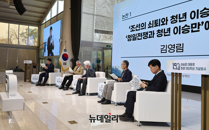 김영림 일본 츄오대 박사, 주대환 죽산조봉암선생기념사업회 부회장, 소설가 복거일 씨가 25일 오후 서울 중구 한국자유총연맹에서 '우남 이승만 세기를 넘어 세대를 잇다'를 주제로 열린 이승만 대통령 탄생 150주년 기념행사에서 논찬을 하고 있다.이날 기념행사는 학술회의, 청년세대와 미래세대 원탁회의로 진행됐다. 학술회의 발표는 이영훈 전 서울대 교수, 김명섭 연세대 교수가 맡았다.이어진 원탁회의에는 조평세 1776연구소 대표, 손영광 바른청년연합대표, 김민아 빌드업코리아 대표, 책읽는사자 사자그라운드 대표, 박상윤 교사, 이현우 연세대 대학원생, 김형균, 박애린 고등학생이 참석했다.